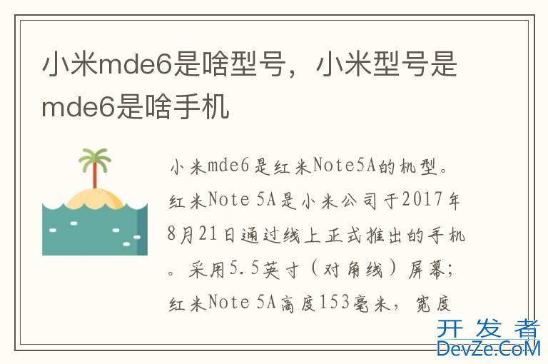 品牌型号:红米Note 5A 系统:MIUI 9小米mde6是红米Note5A的机型。红米Note 5A是小米公司于2017年8月21日通过线上正式推出的手机。采用5.5英寸(对角线)屏幕;红米Not