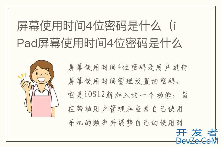 品牌型号:iPhone13pro max 系统:IOS15.4开发者_运维百科 屏幕使用时间4位密码是用户进行屏幕使用时间管理设置的密码。它是iOS12新加入的一个功能,旨
