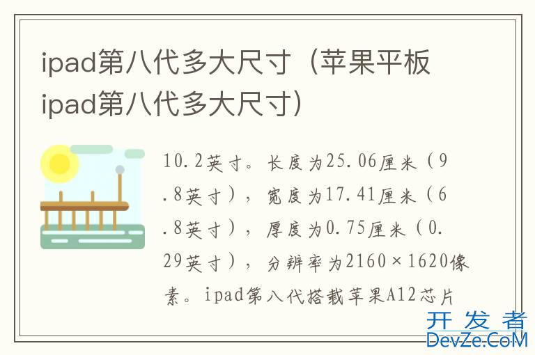 品牌型号:iPad air 第八代 系统:iPad airOS 15.4开发者_运维知识库 ipad第八代屏幕尺寸为10.2英寸。长度为25.06厘米(9.8英寸),宽度为17.41厘米(6.8英寸