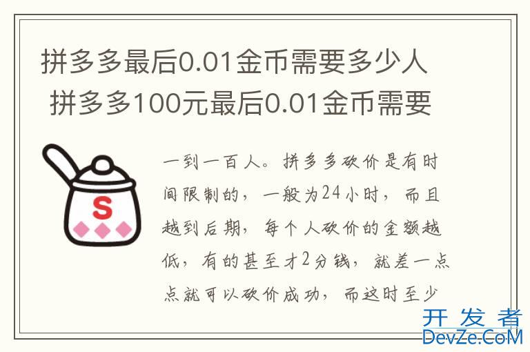 品牌型号:华为P50 系统:HarmonyOS3 软件版本:拼多多6.3.0 拼多多最后0.01金币需要一到一百人。拼多多砍价是有时间限制的,一般为24小时,而且越到后期,每个人砍价的金额越开发者_C
