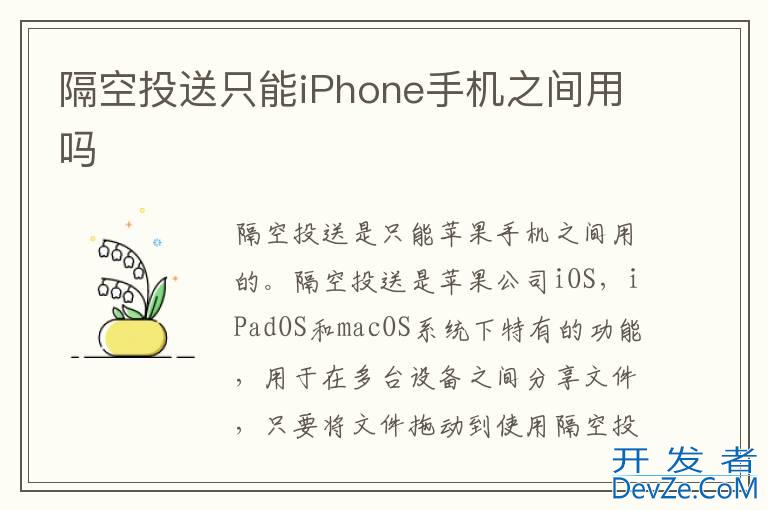 品牌型号:iPhone13 pro pro 系统:iOS 16.0隔空投送是只能iPhone手机之间用的。隔空投送是iPhone公司iOS,iPad airOS和macOS系统下特有的功能,用于在多台