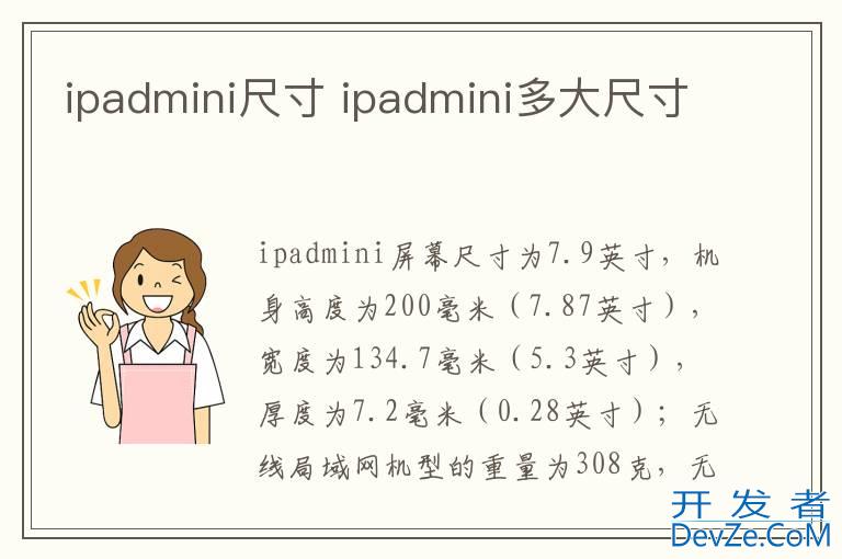 品牌型号:iPad air mini 系统:iOS 6ipadmini屏幕尺寸为7.9英寸,机身高度为200毫米(7.87英寸),宽度为134.7毫米(5.3英寸),厚度为7.2毫米(0.28英寸);