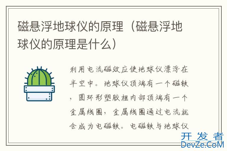 开发者_开发技巧 品牌型号:天屿磁悬浮地球仪 系统:TYFDCXF原理:利用电流磁效应使地球仪漂浮在半空中。地球仪顶端有一个磁铁,圆环形塑胶框内部顶端有一个金属线圈,金属线圈通过电流就会成为电磁铁。