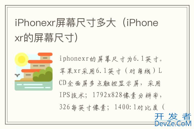 品牌型号:iPhone XR 系统:IOS15.5iPhonexr的屏幕尺寸为6.1英寸。iPhonexr采用6.1英寸(对角线)LCD全面屏多点触控显示屏,采用IPS技术;1792x828像素分辨率
