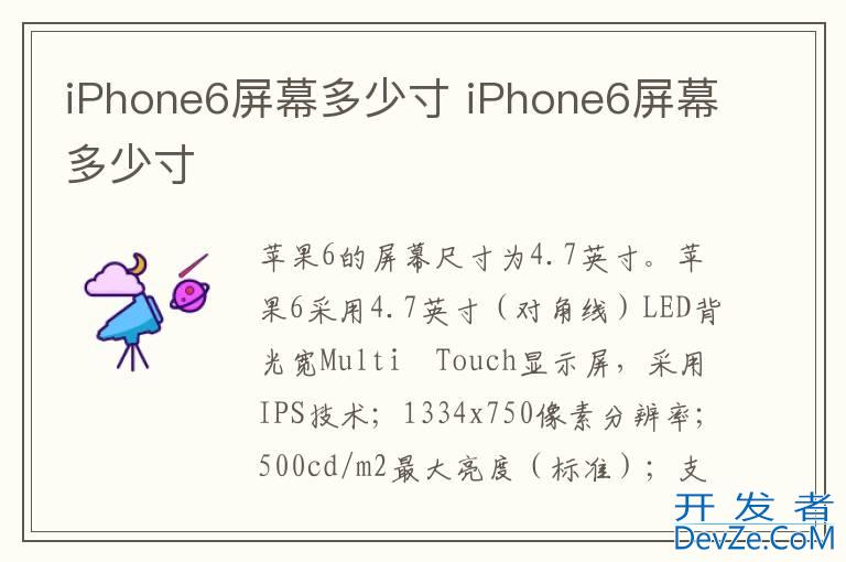 品牌型号:iPhone 6 系统:IOS15.5iPhone6的屏幕尺寸为4.7英寸。iPhone6采用4.7英寸(对角线)LED背光宽Multi‑Touch显示屏,采用IPS技术;1334x750像