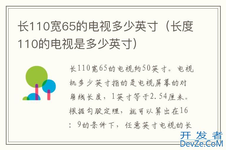 品牌型号:小米电视 系统:L70M7-EA长110宽65的电视约50英寸。电视机多少英寸指的是电视屏幕的对角线长度,1英寸等于2.54厘米。根据勾股定理,就可以算出在16:9的条件下,任意英寸电开发者