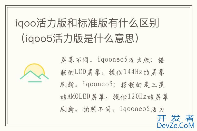 品牌型号:vivo iQOO Neo5 系统:Android 111、屏幕不同。iqooneo5活力版:搭载的LCD屏幕,并且为用户提供144Hz的屏幕刷新,为用户提供1080p分辨率。iqooneo