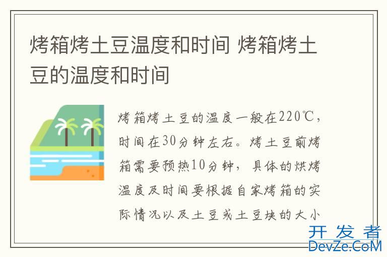 品牌型号:苏泊尔电烤箱 系统:K35FC825烤箱烤土豆的温度一般在220℃,时间在30分钟左右。烤土豆前烤箱需要预热10分钟,具体的烘烤温度及时间要根据自家烤箱的实际情况以及土豆或土豆块的大小来决定