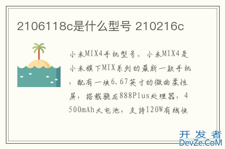 品牌型号:小米MIX4 系统:MIUI12.5开发者_开发百科 2106118c是小米MIX4手机型号。小米MIX4是小米旗下MIX系列的最新一款手机,配有一块6.67