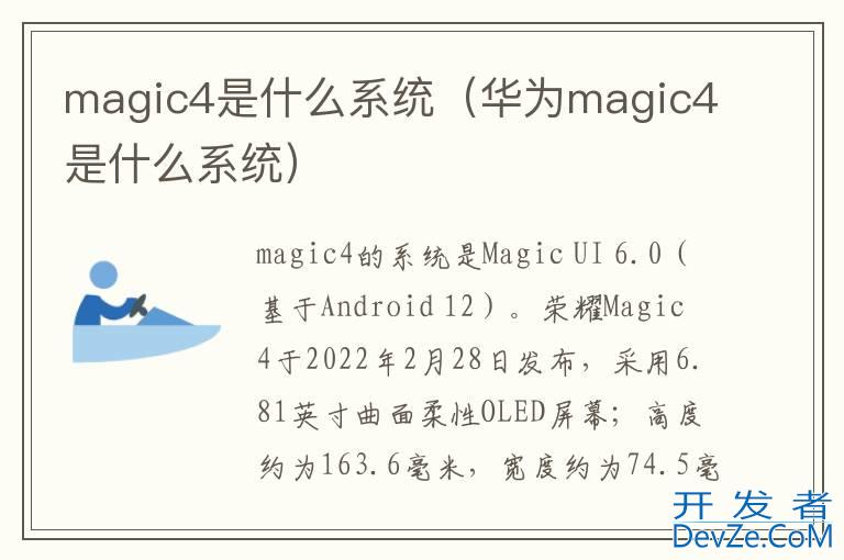 开发者_运维技巧 品牌型号:荣耀Magic 4 系统:Magic UI 6.0magic4的系统是Magic UI 6.0(基于Android 12)。荣耀Magic 4于2022年2月28日发布