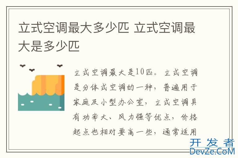 品牌型号:海尔立式空调 系统:RFLDC280DXSAYC立式空调最大是10匹。立式空调是分体式空调的一种,普遍用于家庭及小型办公室,立式空调具有功率大、风力强等优点,价格起点也相对要高一些,通常适用