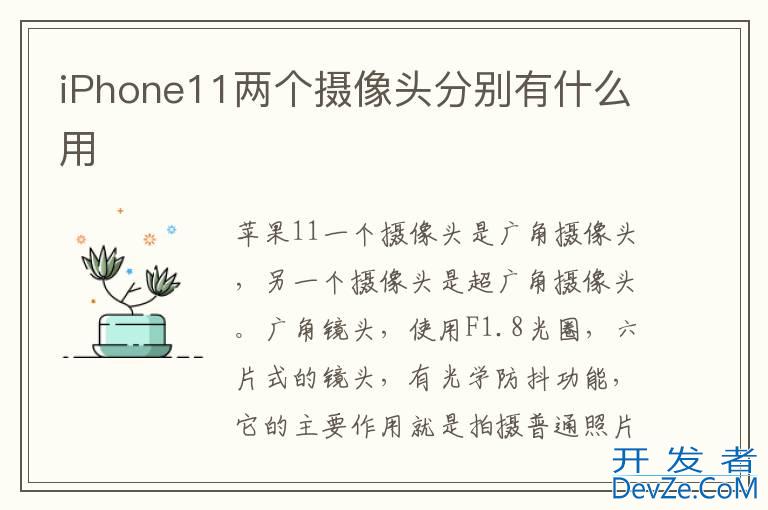 品牌型号:iPhone11 系统:IOS15.4iPhone11一个摄像头是广角摄像头,另一个摄像头是超广角摄像头。广角镜头,使用F1.8光圈,六片式的镜头,有光学防抖功能,它的主要作用就是拍摄普通照