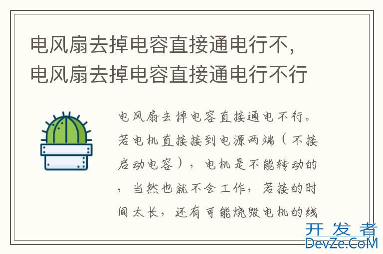 品牌型号:格力电风扇 系统:FDZ-35X61Bg7电风扇去掉电容直接通电不行。若电机直接接到电源两端(不接启动电容),电机是不能转动的,当然也就不会工作,若接的时间太长,还有可能烧毁电机的线圈。因为