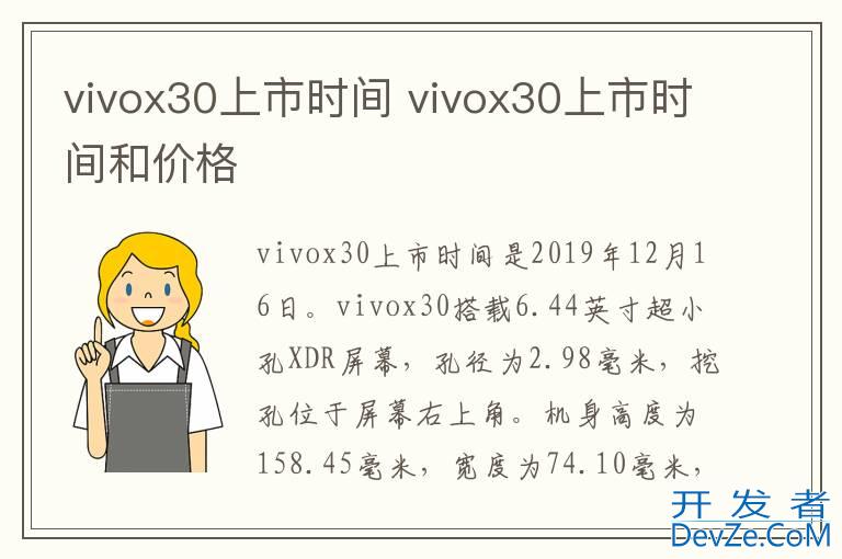 品牌型号:vivox30 系统:FuntouchOS10vivox30上市时间是2019年12月16日。vivox30搭载6.44英寸超小孔XDR屏幕,孔径为2.98开发者_高级运维毫米,挖孔位于屏幕