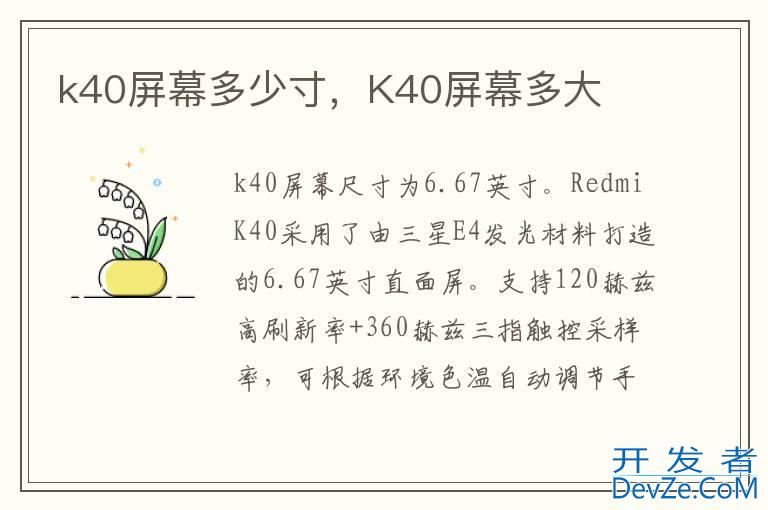 品牌型号:Redmi K40 系统:MIUI 12k40屏幕尺寸为6.67英寸。RedmiK40采用了由三星E4发光材料打造的6.67英寸直面屏。这块屏幕还支持120赫兹高刷新率+360赫兹三指触控采