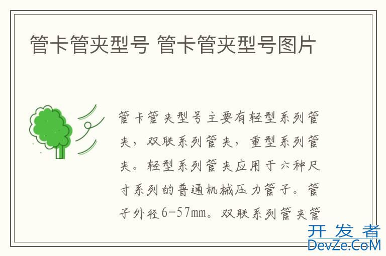 品牌型号:佰瑞特管卡管夹 系统:M12开发者_JAVA百科 管卡管夹型号主要有轻型系列管夹,双联系列管夹,重型系列管夹。轻型系列管夹应用于六种尺寸系列的普通机械压力管子。管子外径