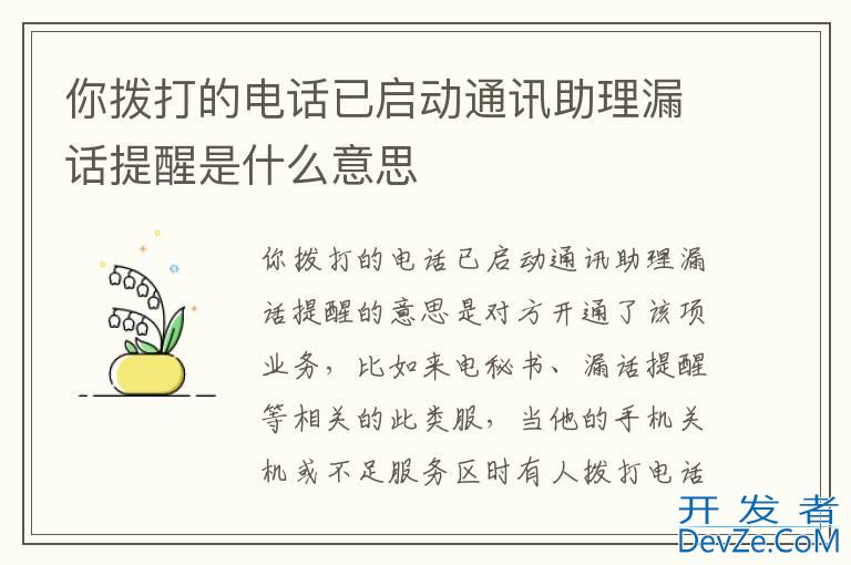 品牌型号:小米12Pro 系统:MIUI13你拨打的电话已启动通讯助理漏话提醒的意思是对方开通了该项业务,比如来电秘书、漏话提醒等相关的此类服,当他的手机关机或不足服务区时有人拨打电话,待开机或有信号