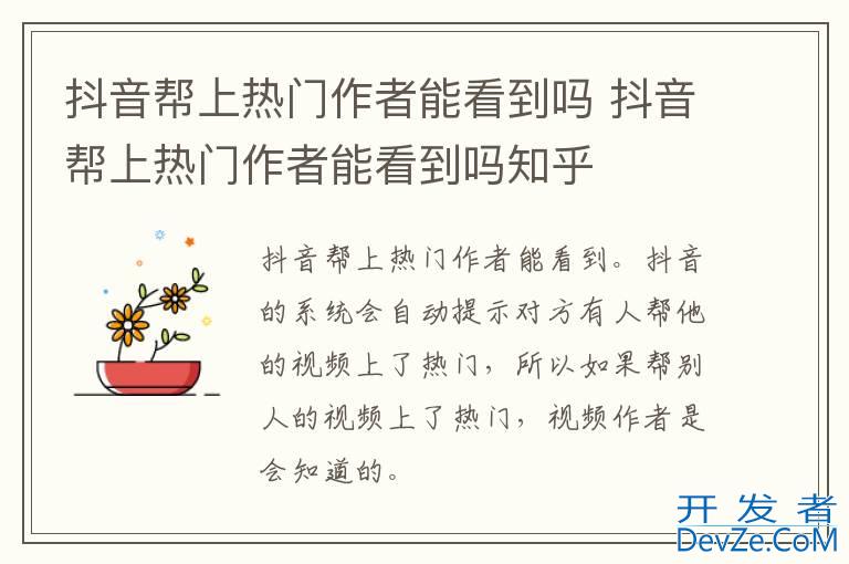 品牌型号:iPhone13 pro pro 系统:IOS15.4 软件版本:抖音20.5.开发者_JAVA百科0抖音帮上热门作者能看到。抖音的系统会自动提示对方有人帮他的视频上了热门,所以如果帮别人的
