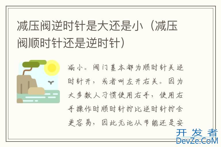 品牌型号:繁瑞减压阀 系统:YQT-731减压阀逆时针是减小。阀门基本都为顺时针关逆时针开,或者叫左开右关。因为大多数人习惯使用右手,使用右手操作时顺时针拧比逆时针拧会更容易,因此无论从节能还是安全方