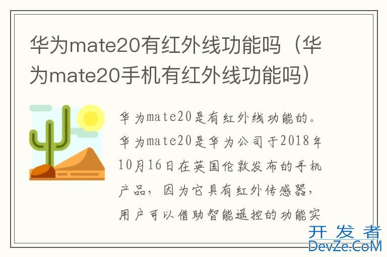 品牌型号:HUAWEI Ma开发者_开发问答te 20 系统:EMUI9.0华为mate20是有红外线功能的。华为mate20是华为公司于2018年10月16日在英国伦敦发布的手机产品,因为它具有红外