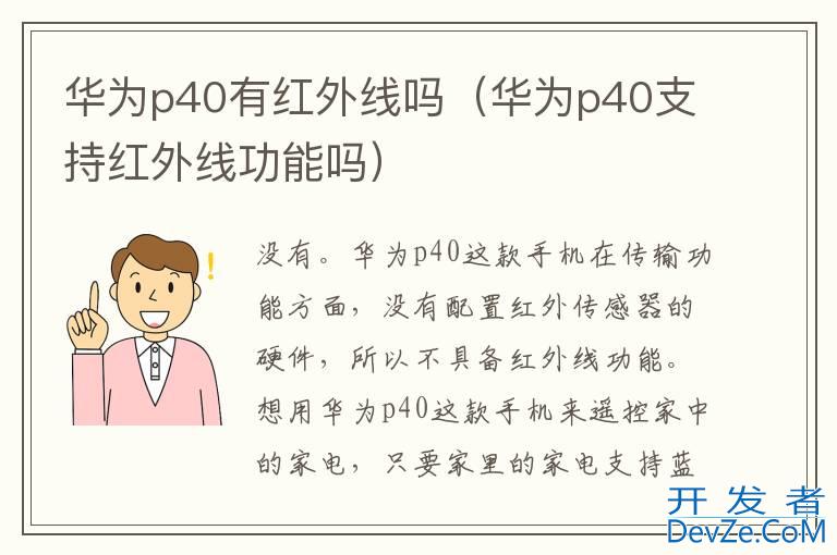 品牌型号:HUAWEI P40 系统:EMUI10.1华为p40没有红外线功能。华为p40这款手机在传输功能方面,没有开发者_C百科配置红外传感器的硬件,所以不具备红外线功能。想用华为p40这款手机来
