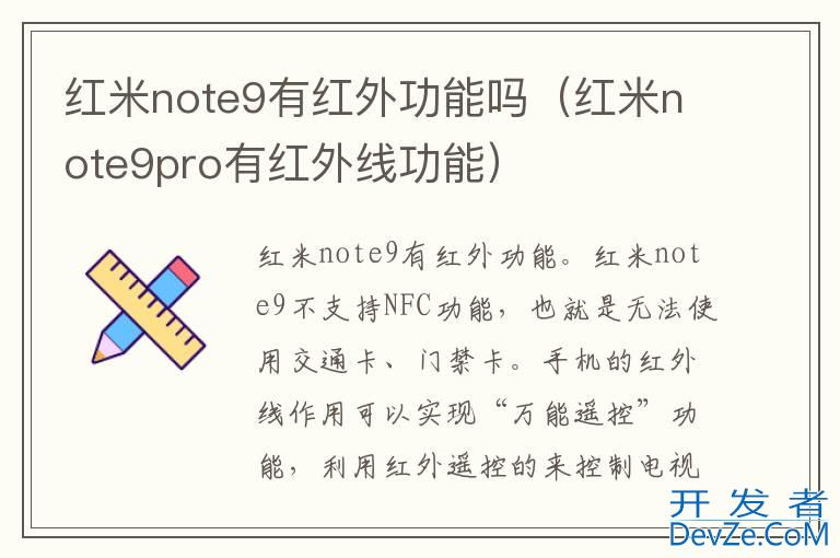 品牌型号:Redmi Note 9 系统:MIUI 13红米note9有红外功能。红米note9不支持NFC功能,也就是无法使用交通卡、门禁卡。手机的红外线作用可以实现“万能遥控”功能,利用红外遥控的