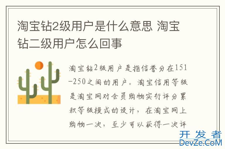开发者_开发百科 品牌型号:华为P50 系统:HarmonyOS3 软件版本:淘宝10.11.10淘宝钻2级用户是指信誉分在151-250之间的用户。信誉等级分为心、钻、冠三档,每档五个等级,共计15