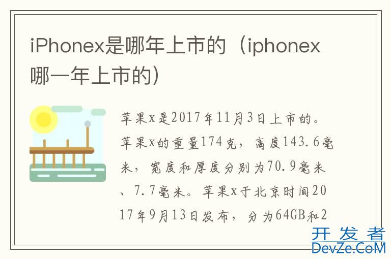 品牌型号:iPhonex 系统:IOS15.5iPhonex是2017年11月3日上市的。iPhonex的重量174克,高度143.6毫米,宽度和厚度分别为70.9毫米、7.7毫米,2436*1125
