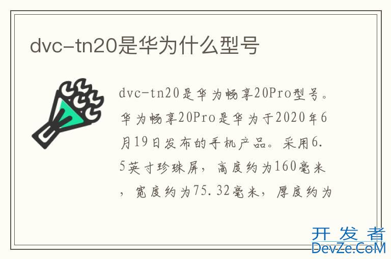 品牌型号:华为畅享20Pro 系统:EMUI 10.1开发者_开发技巧 dvc-tn20是华为畅享20Pro型号。华为畅享20Pro是华为于2020年6月19日发布