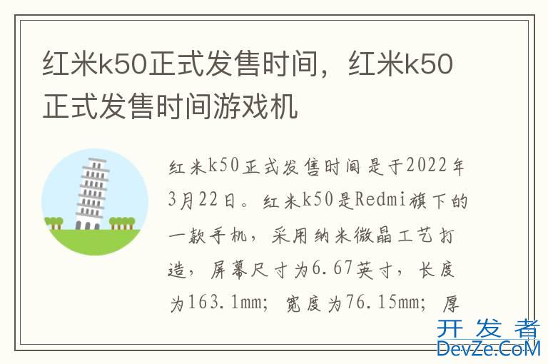 品牌型号:红米k50 系统:MIUI13开发者_如何学Python红米k50正式发售时间是于2022年3月22日。红米k50是Redmi旗下的一款手机,采用纳米微晶工艺打造,屏幕尺寸为6.67英寸,长
