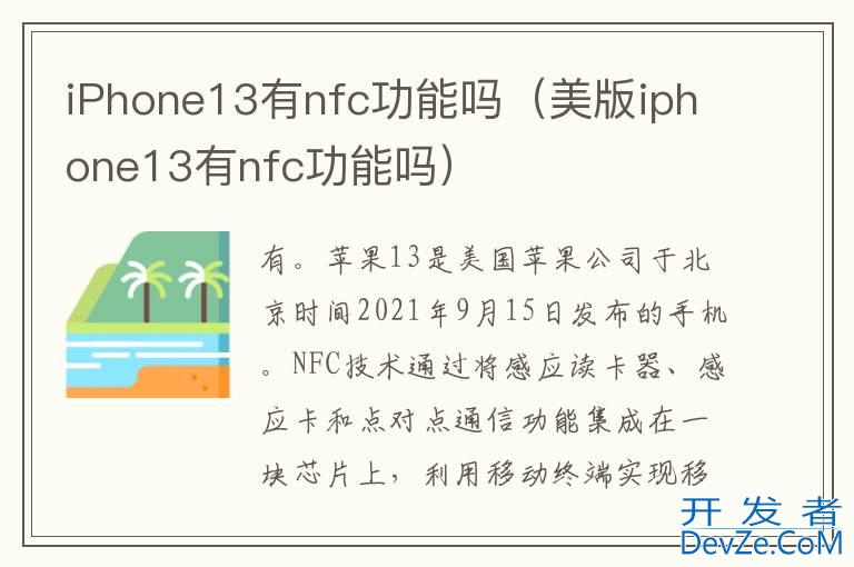 品牌型号:iPhone13 系统:iOS 16.0iPhone13是有nfc功能的。iPhone13是美国iPhone公司于北京时间2021年9月15日发布的手机。使用NFC技术的设备可以在彼此靠近时