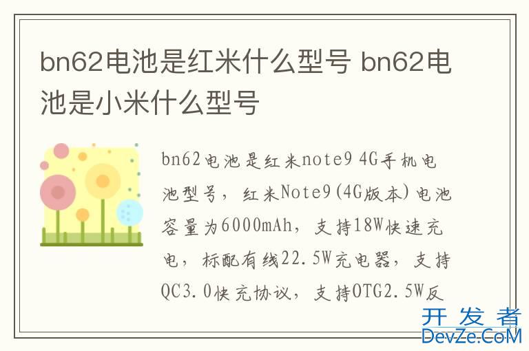 品牌型号:Redmi Note 9 系统:Android 11bn62电池是红米note9 4G手机电池型号,红米Note9(4G版本)电池容量为6000mAh,支持18W快速充电,标配有线22.5W