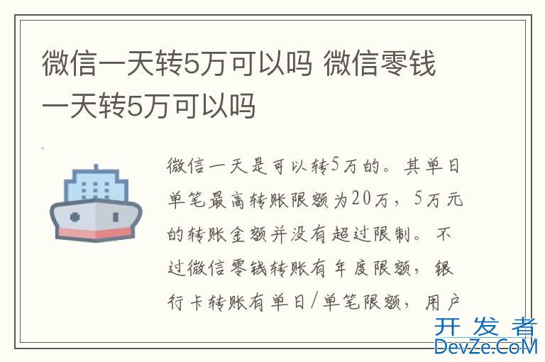 品牌型号:iPhone13 pro pro 系统:iOS 15.6.1 软件版本:微信8.0.26开发者_高级运维 微信一天是可以转5万的。其单日单笔最高转账限额为20万,5万元的转账金额并没有