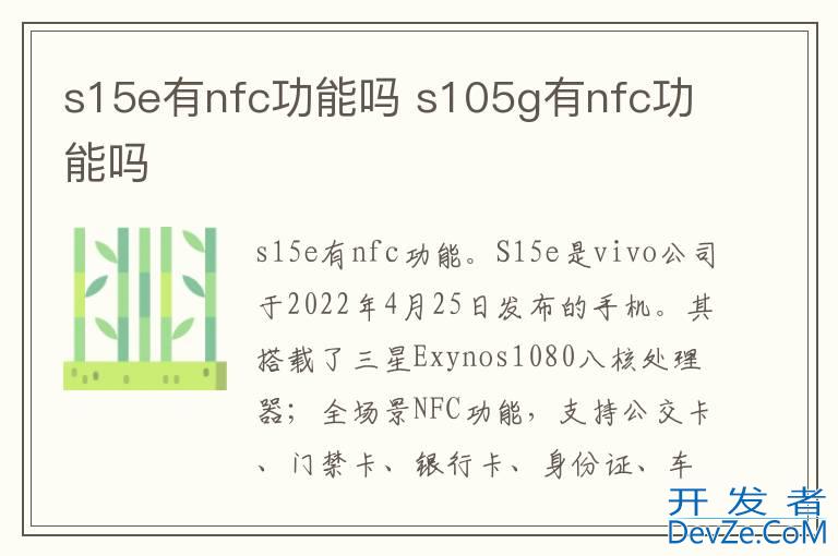 品牌型号:vivo S15e 系统:OriginOS Oceans15e有nfc功能。S15e是vivo公司于2022年4月25日发布的手机。其搭载了三星Exynos1080八核处理器;全场景NFC功
