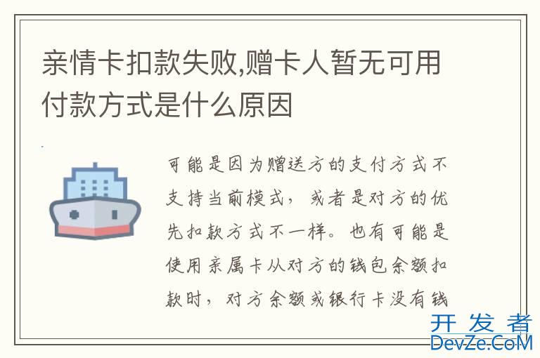 品牌型号:华为P50 系统:HarmonyOS3 软件版本:支付宝10.2.60.8000亲情卡扣款失败,赠卡人暂无可用付款方式的原因:1、可能是因为赠送方的支付方式不支持当前模式,或者是对方的优先扣