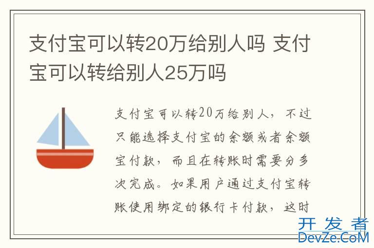 品牌型号:华为P50 系统:HarmonyOS3 软件版本:支付宝10.2.60.8000支付宝可以转20万给别人,不过只能选择支付宝的余额或者余额宝付款,而且在转账时需要分多次完成。如果用户通开发者