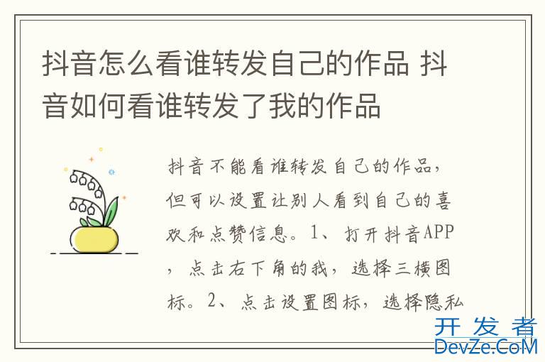 品牌型号:iPhone13 pro 系统:IOS15.4 软件版本:抖音19.9.0以抖音19.9开发者_高级运维.0为例,抖音不能看谁转发自己的作品,但可以设置让别人看到自己的喜欢和点赞信息。分为3