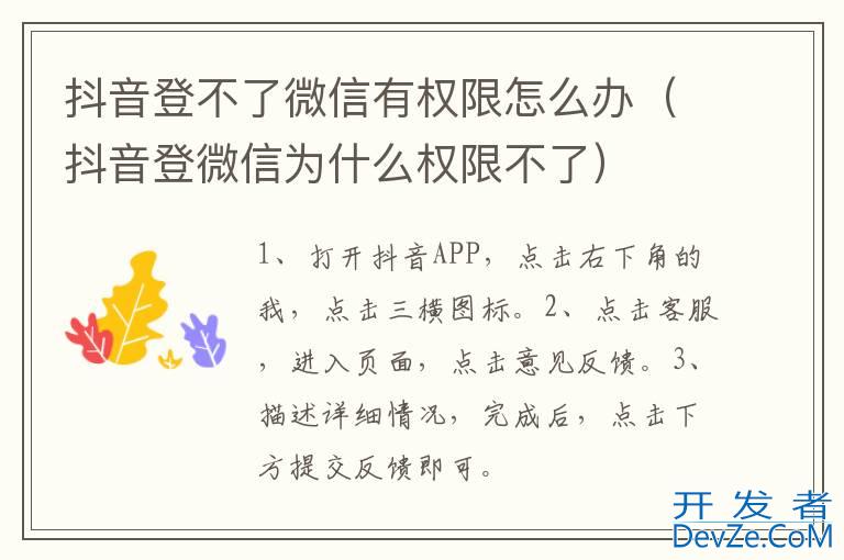 品牌型号:iPhone13 pro 系统:IOS15.4 软件版本:抖音开发者_JS百科19.9.0以抖音19.9.0为例,抖音登不了微信有权限可以反馈客服。分为3步,具体步骤如下:1进入抖音三横图标