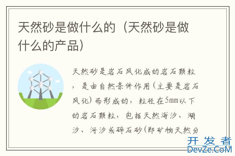 天然砂是岩石风化成的岩石颗粒,是由自然条件作用(主要是岩石风化)而形成的,粒径在5mm以下的岩石颗粒,包括天然海沙、湖沙、河沙或碎石砂(即矿物天然分裂为细小的砂粒)。天然砂是做建筑、混凝土、筑路材料、