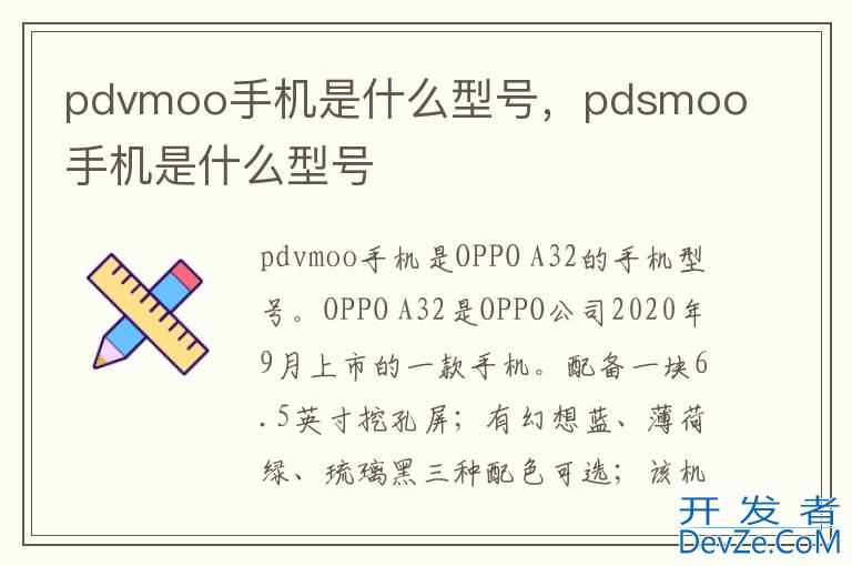 品牌型号:OPPO A32 系统:colorOS12.1pdvmoo手机是OPPO A32的手机型号。OPPO A32是OPPO公司2020年9月上市的一款手机。OPPO A32配备一块6.5英寸挖孔