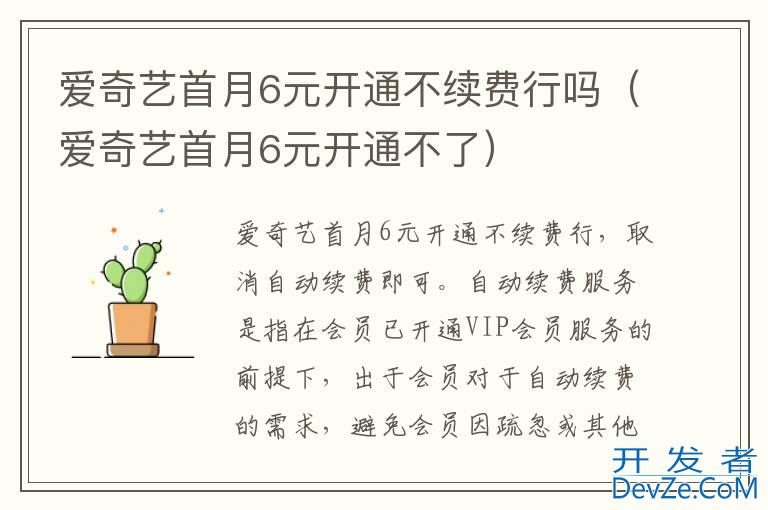品牌型号:iPhone13 pro pro 系统:iOS 15.5 软件版本:爱奇艺13.7.1爱奇艺首月6元开通不续费行,取消自动续费即可。自动续费服务是指在会员已开通VIP会员服务的前提下,出于会