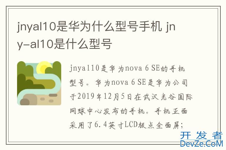 品牌型号:华为nova 6 SE 系统:EMUI 10.0.1jnyal10是华为nova 6 SE的手机型号。华为nova 6 SE是华为公司于2019年12月5日在武汉光谷国际网球中心发布的手机。