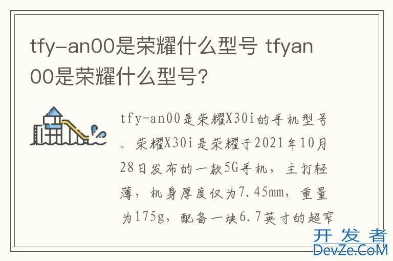 品牌型号:荣耀X30i 系统:Magic UI 5.0开发者_StackOverflow中文版 tfy-an00是荣耀X30i的手机型号。荣耀X30i是荣耀于2021年10月28日发布的一
