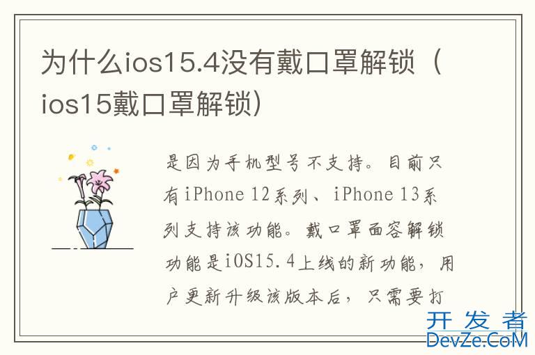 品牌型号:iPhone13 pro 系统:IOS15.4是因为手机型号不支持。目前只有iPhone 12 pro系列、iPhone13 pro系列支持该功能。戴口罩面容解锁功能是iOS15.4上线的新