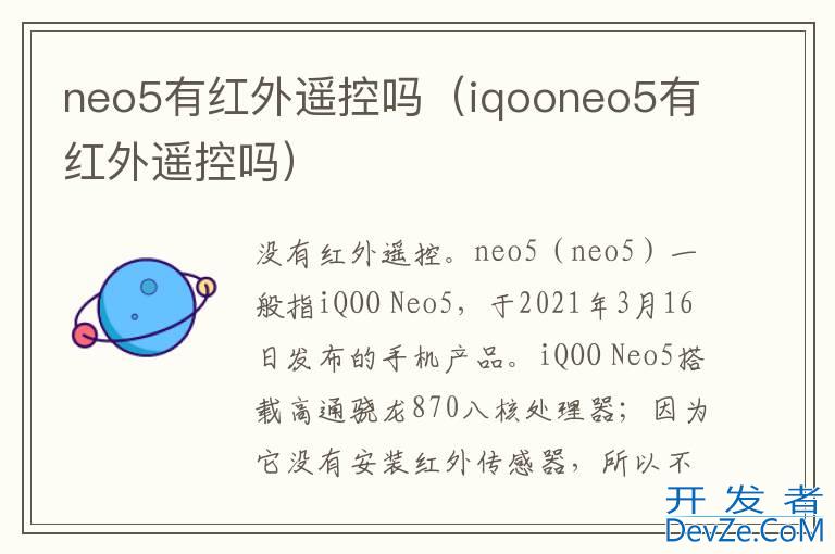 品牌型号:iQOO Neo5 系统:OriginOS for iQOOneo5没有红外遥控。neo5(neo5)一般指iQOO Neo5,于2021年3月16日发布的手机产品。开发者_如何学GoiQO