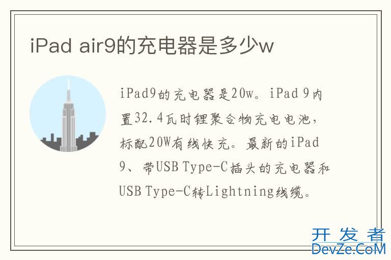 品牌型号:Apple充电器 系统:Apple 20W USB-C开发者_Go百科 iPad air9的充电器是20w。iPad air 9内置32.4瓦时锂聚合物充电电池