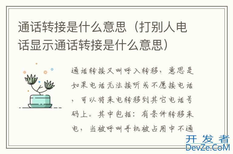 品牌型号:iPhone13 pro pro 系统:IOS15.4通话转接又叫呼入转移,意思是如果电话无法接听或不愿接电话,可以将来电转移到其它电话号码上。其中包括:有条件转移来电,当被呼叫手机被占用中