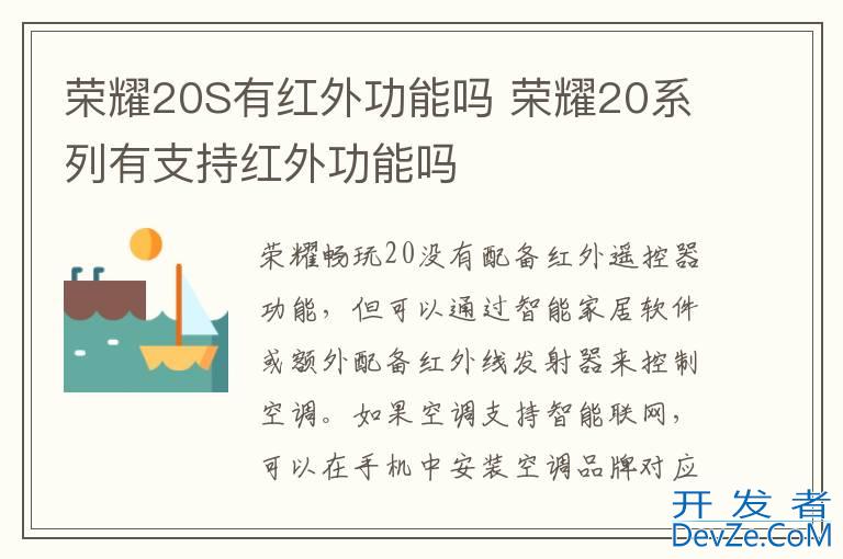 品牌型号:荣耀20S 系统:Magic UI 4.0荣耀20S没有配备红外遥控器功能,但可以通过智能家居软件或额外配备红外线发射器来控制空调。如果空调支持智能联网,可以在手机中安装空调品牌对应的智能应