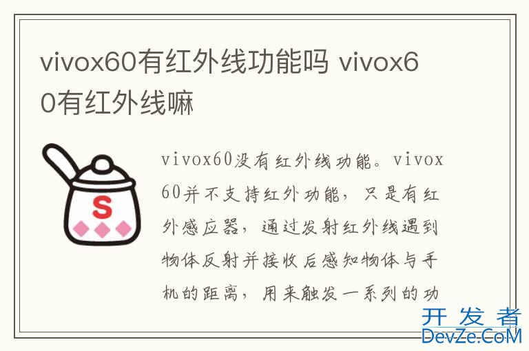 品牌型号:vivo X60 系统:OriginOS 1.0 vivox60没有红外线功能。vivox60并不支持红外功能,只是有红外感应器,通过发射红外线遇到物体反射并接收后感知物体与手机的距离,用来