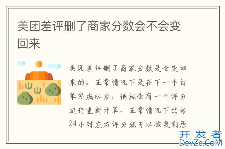 品牌型号:iPhone13 pro pro 系统:IOS15.5 软件版本:美团12.1.204美团差评删了商家分数是会变回来的。美团的差评再被删除以后评分想要恢复过来的话,正常情况下是在下一个订单完